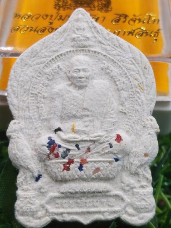 พระผงนั่งพาน รุ่นรวยพันล้าน หลวงปู่มหาศิลา สิริจันโท ยุคต้นปี 64 เนื้อขาวผงพุทธคุณฝังพลอยเสก no.285 |