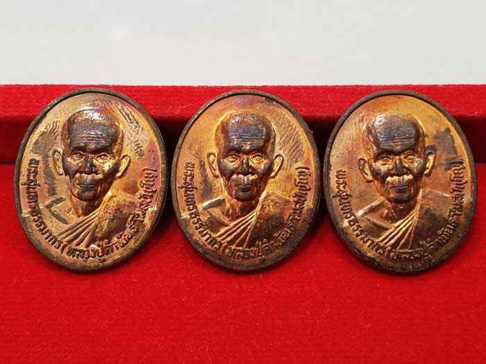 เหรียญหลังโต๊ะหมู่ ผ่านตลอดปลอดภัย หลวงปู่ผ่าน ปัญญาปทีโป ปี 2551 เนื้อทองฝาบาตร |