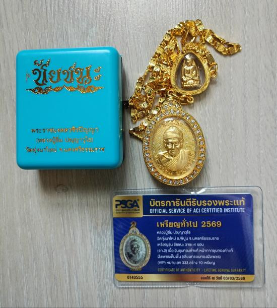 วัดใจเคาะเดียวแดงจ้า เหรียญชัยชนะหลวงปู่อิ่ม วัดทุ่งนาใหม่ เนื้อเงินชุบน้ำทองคำแท้ ฝังเพชรเต็มพื้น พร้อมชุดสร้อย สร้าง10เหรียญ หมายเลข333 พร้อมบัตรรับรอง PSGA เคาะเดียวแดงจ้า |