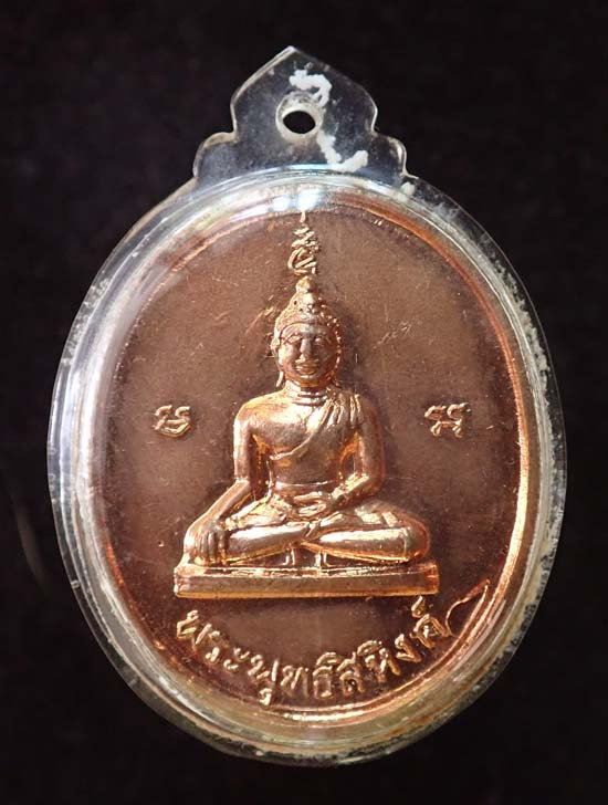 เหรียญพระพุทธสิหิงค์ หลังพระบรมธาตุนครศรีธรรมราช (พิมพ์กรรมการ) ปี 2517 (พิธีพุทธาภิเษกใหญ่ ในหลวงเสด็จในพิธี อจ.นำ,ลป.หมุน,ครูกาแก้ว ฯลฯ ปลุกเสก) เนื้อทองแดงผิวไฟ สวยมาก เลี่ยมพลาสติกเก่า |