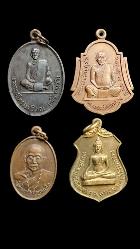 **100.** (4เหรียญ)1เหรียญพระประธานวัดโคกเมรุ อ.ฉวาง ปี2517+1เหรียญพ่อท่านแก้ว วัดเขาปูน นครศรีฯ ปี2529+1เหรียญพระธรรมรัตโนภาส วัดพระมหาธาตุวรมหาวิหาร นครศรีฯ ปี2537+1เหรียญพระครูสถิตธรรมโสภณ(คลิ้ง ฐาน |