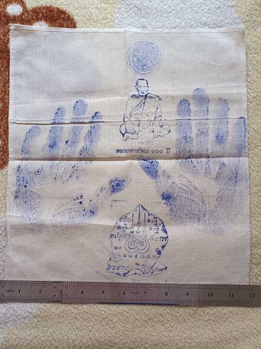 ผ้ายันต์ปั๊มสดรอยมือ หลวงพ่อพัฒน์ วัดห้วยด้วน จัดสร้างวาระอายุครบ 100 ปี |
