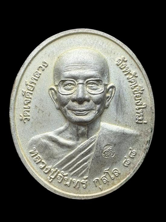 เหรียญหลวงปู่จันทร์ กุสโล เนื้อเงิน รุ่นเงินทันใจ หลังหลวงพ่อเงินทันใจ จัดเจดีย์หลวง จ.เชียงใหม่ ปี 2548 |