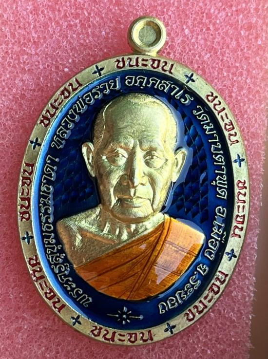 เหรียญรุ่นเจริญพร 7 รอบ เนื้ออัลปาก้าลงยา ตัวหนังสือขอบเจริญพรสีน้ำเงิน ลงยาจีวร หลวงปู่บุญมา โชติธมโม สำนักสงฆ์เขาแก้วทอง (---A83---)