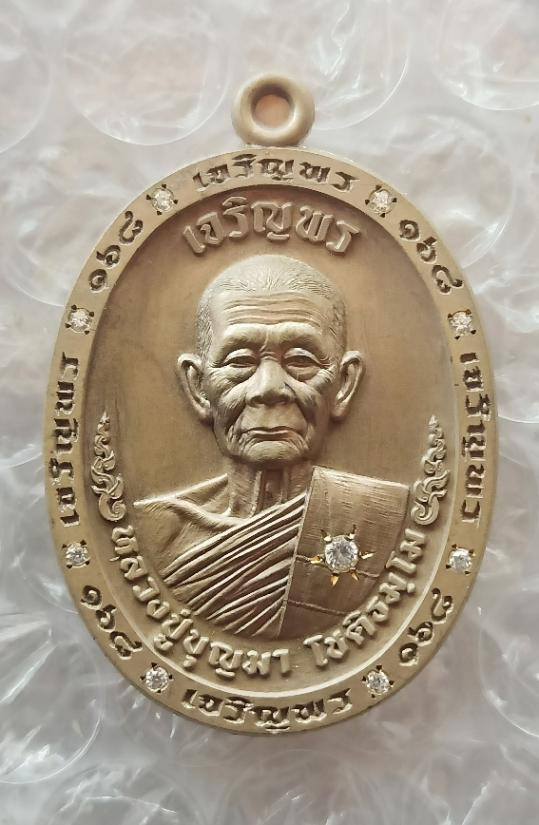 หรียญรุ่นเจริญพรหันข้าง เนื้อชุบเงินลงยาพื้นสีขมพู ลงยาจีวร ฝังเพชร CZ หลวงปู่บุญมา โชติธมโม สำนักสงฆ์เขาแก้วทอง (---A82---)