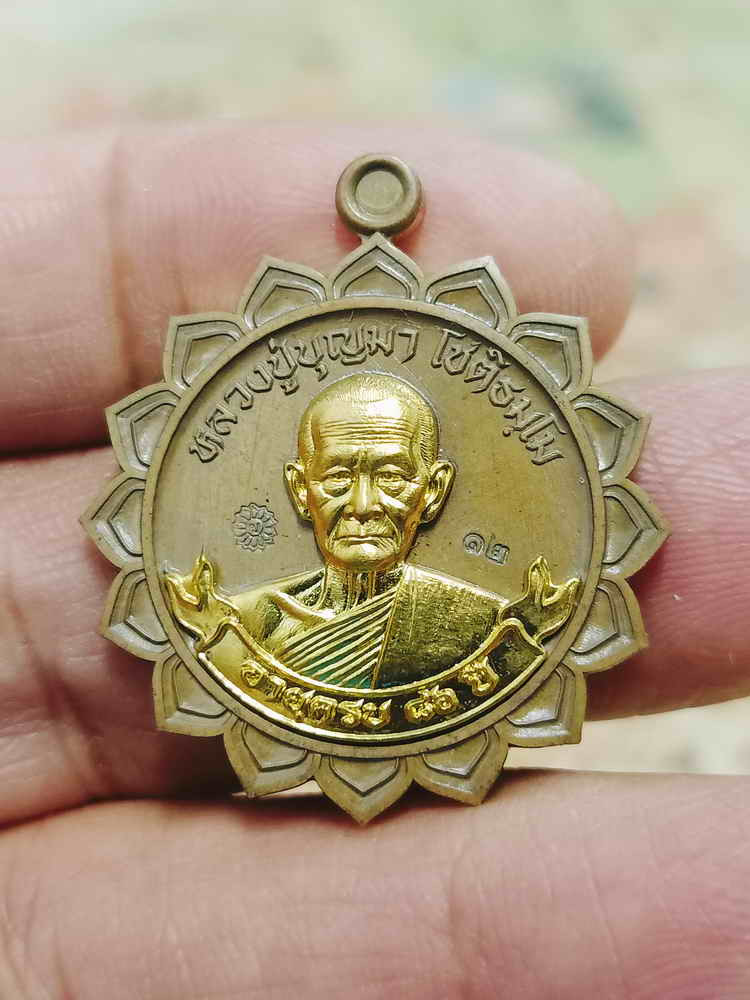 เหรียญเจริญบารมี ปี 2565 เนื้อทองฝาบาตร หน้ากากเงินลงยาจีวรเหลือง หมายเลข **58** สร้างน้อย 140 เหรียญ หลวงปู่เปลว วัดเจ็ดลูกเนิน ( ไม่มีกล่อง ) ขนาดความสูงจากหูเหรียญ 4 ซม กว้าง 3 ซม. |