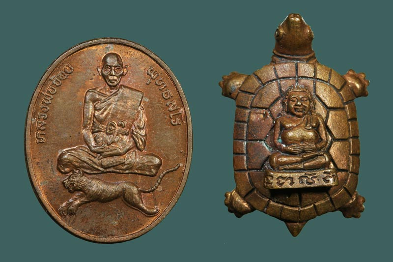 เหรียญนั่งเสือ และเต่า (เนื้อทองแดง) หลวงพ่อจ้อย วัดหนองน้ำเขียว จ.ชลบุรี |