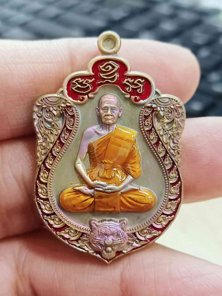 เหรียญอาร์มใหญ่ หลวงปู่บุญมา สำนักสงฆ์เขาแก้วทอง จ.ปราจีนบุรี รุ่น"พยัคฆ์กบินทร์บุรี" (เสือ 11 ตัว) รายการที่ 44 เนื้อทองทิพย์ลงยาแดงขอบลายธงชาติ เลข 438 พร้อมกล่อง (ขนาดของเหรียญ 4.2*3.3 ซม.) |