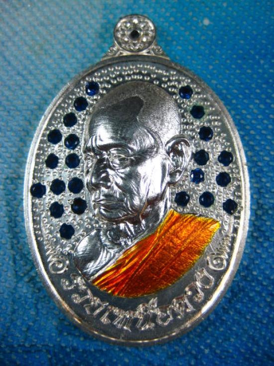 เหรียญ รวยเหนือดวง เนื้อกะหลั่ยเงิน ฝังทับทิมพื้นด้านหน้า ด้านหลังลงยาน้ำเงิน ลงยาจีวร หลวงปู่บุญมา ไม่มีกล่องเดิม แต่มีกล่องแทนให้ (---A61---) |