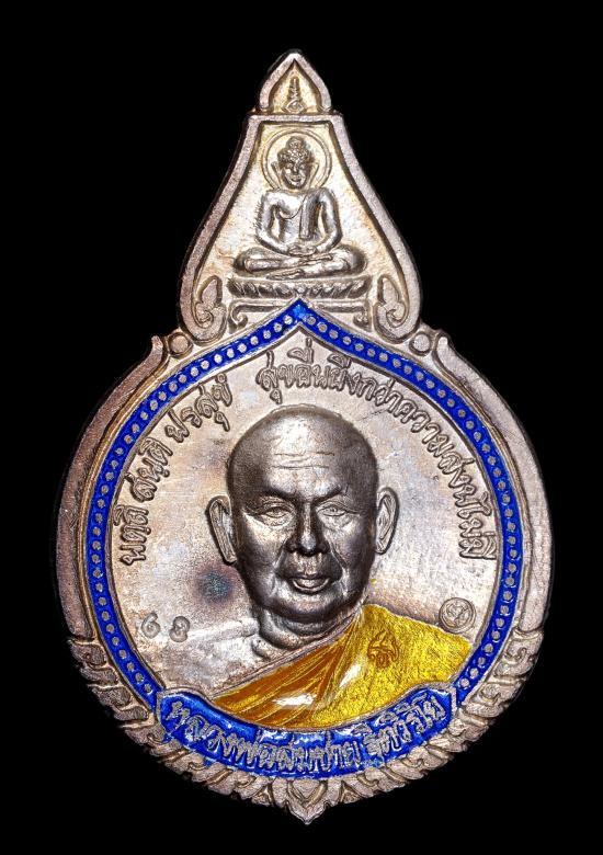 เหรียญ รวยเหนือดวง เนื้อกะหลั่ยเงิน ฝังทับทิมพื้นด้านหน้า ด้านหลังลงยาน้ำเงิน ลงยาจีวร หลวงปู่บุญมา ไม่มีกล่องเดิม แต่มีกล่องแทนให้ (---A61---) |