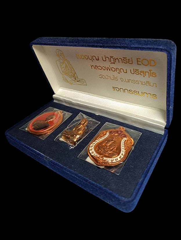 เหรียญปาฏิหาริย์ EOD ชุดซื้อที่ดิน ชุดกองบุญรับพระ 3 องค์ หลวงพ่อคูณ วัดบ้านไร่ จ.นครราชสีมา หมายเลข 1732 |