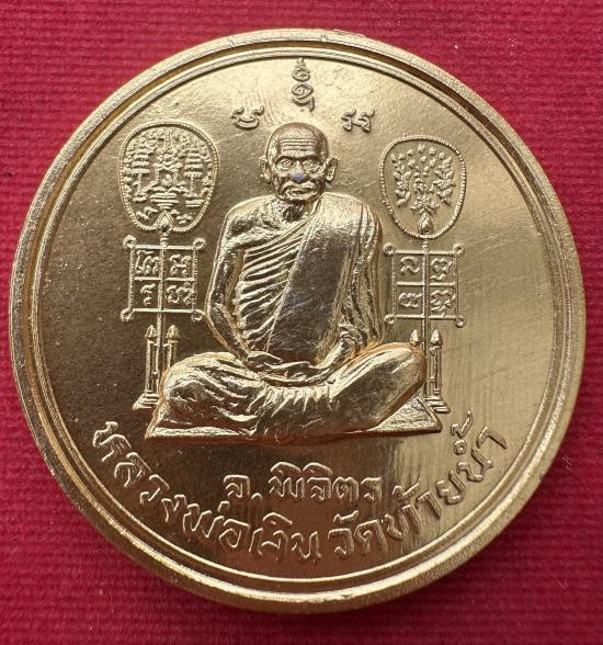 เหรียญขวัญถุงหลวงพ่อเงินวัดท้ายน้ำ เนื้ออลูมิเนียมกะไหล่ทอง รุ่นฉลองสะพานปี 2531 ขนาด 5 ซ.ม.