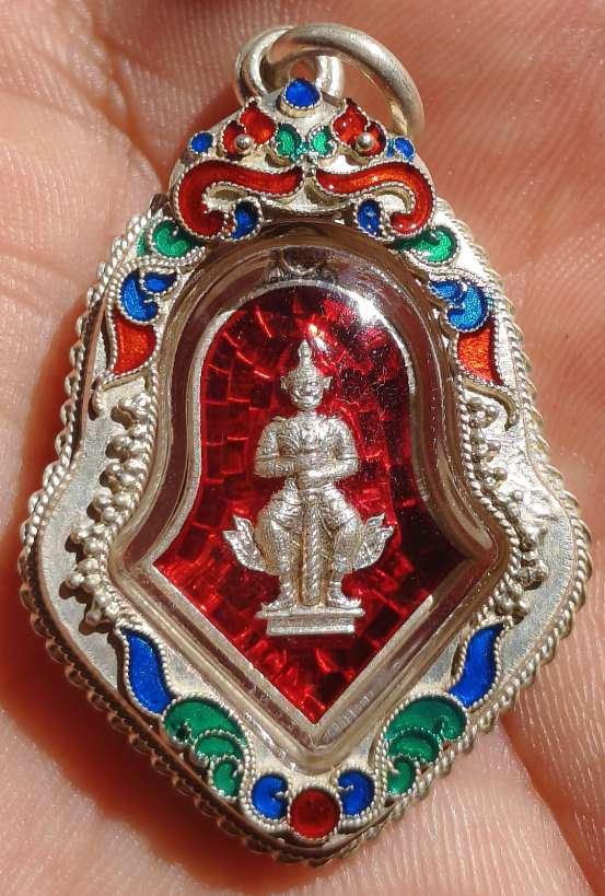 รุ่น พิมพ์สามเหลี่ยมหลวงพ่อโสธร-หลังท้าวเวสสุวรรณ พรปีใหม่ หลวงพ่ออิฎฐ์ วัดจุฬามณี เนื้อเงินลงยา |