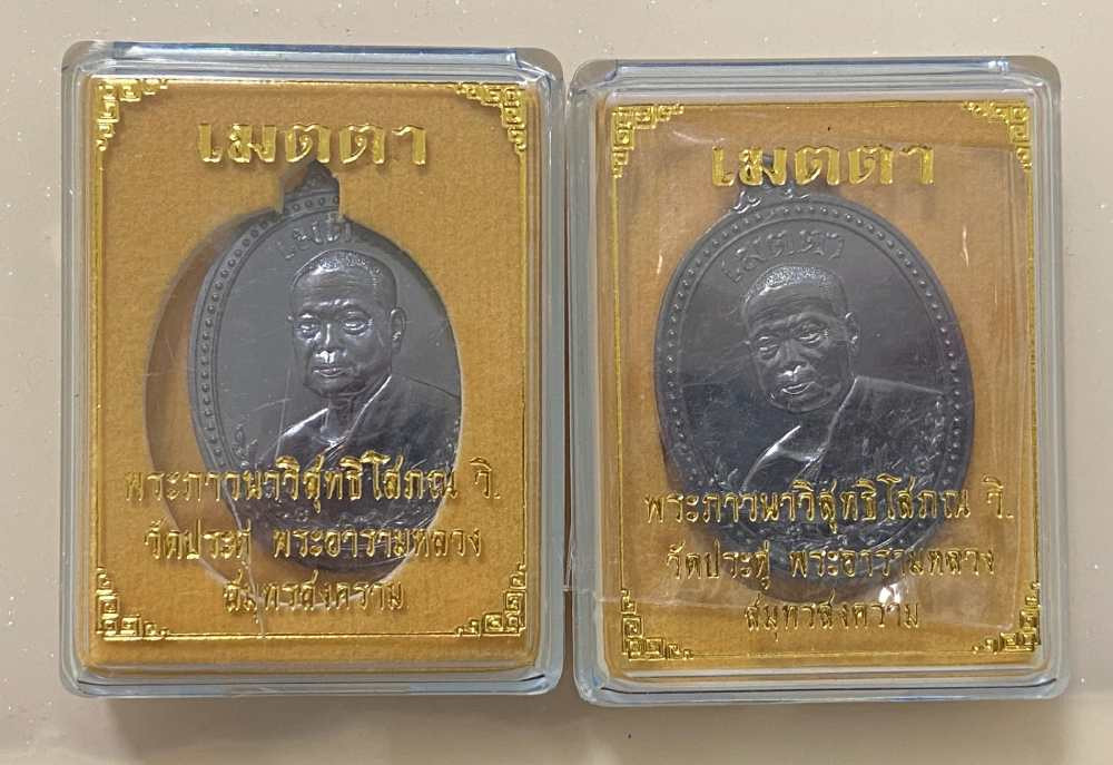 เหรียญเมตตา พระภาวนาวิสุทธิโสภณ (หลวงพ่อพระมหาสุรศักดิ์ อติส กฺโข) วัดประดู่ พระอารามหลวง อ.อัมพวา จ.สมุทรสงคราม เนื้อทองแดง 2 องค์ ปี 2566 |