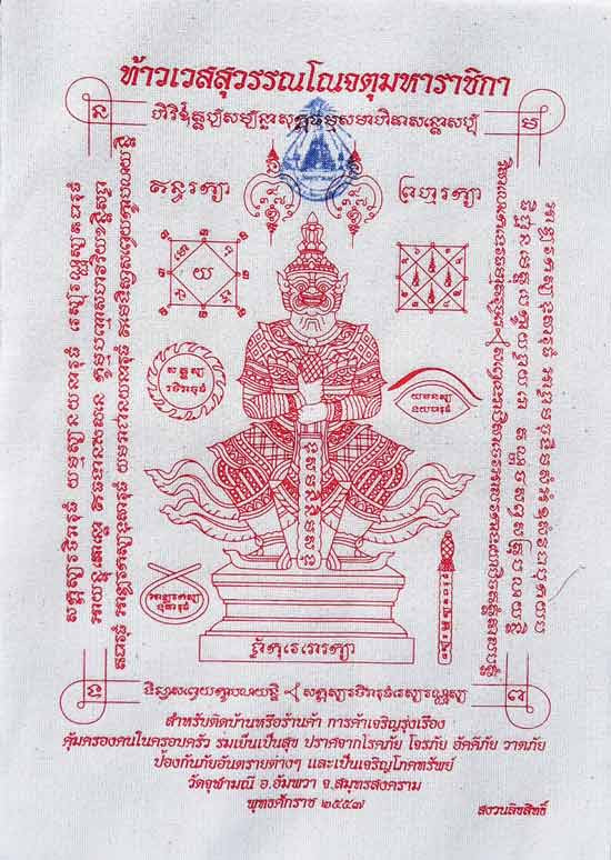 ผ้ายันต์ท้าวเวสสุวรรณโณ วัดจุฬามณี หลวงพ่ออิฎฐ์ ปั๊มตรายางวัดจุฬามณีขนาดA4 ปี2557 พื้นสีขาวตัวหนังสือสีแดง |