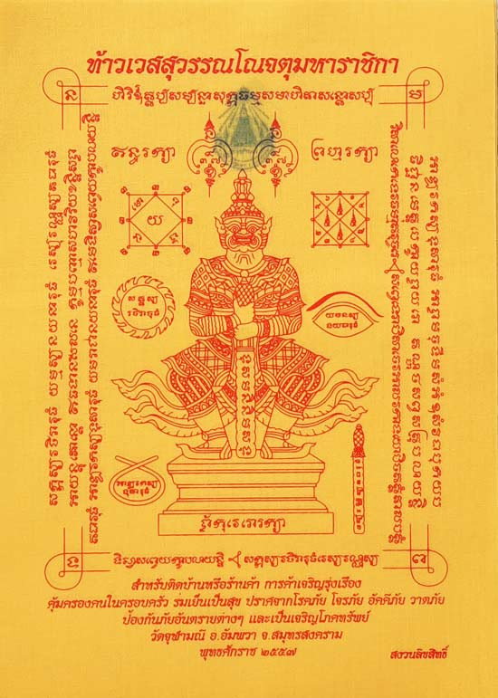 ผ้ายันต์ท้าวเวสสุวรรณโณ วัดจุฬามณี หลวงพ่ออิฎฐ์ ปั๊มตรายางวัดจุฬามณีขนาดA4 ปี2557 พื้นสีเหลืองตัวหนังสือสีแดง |