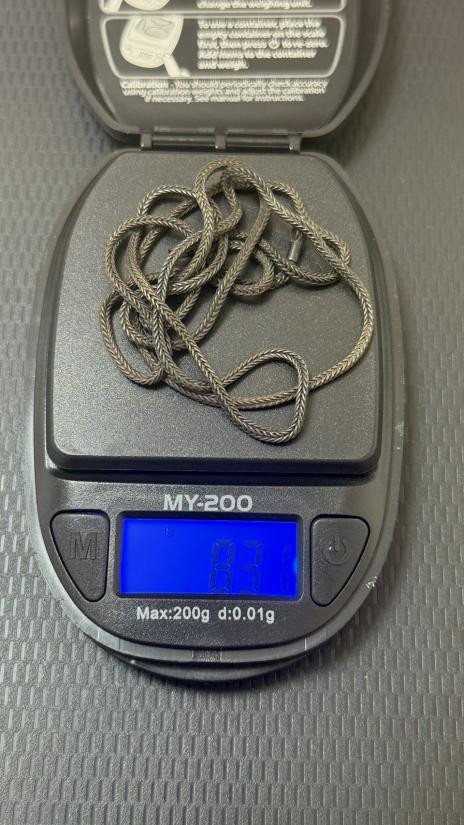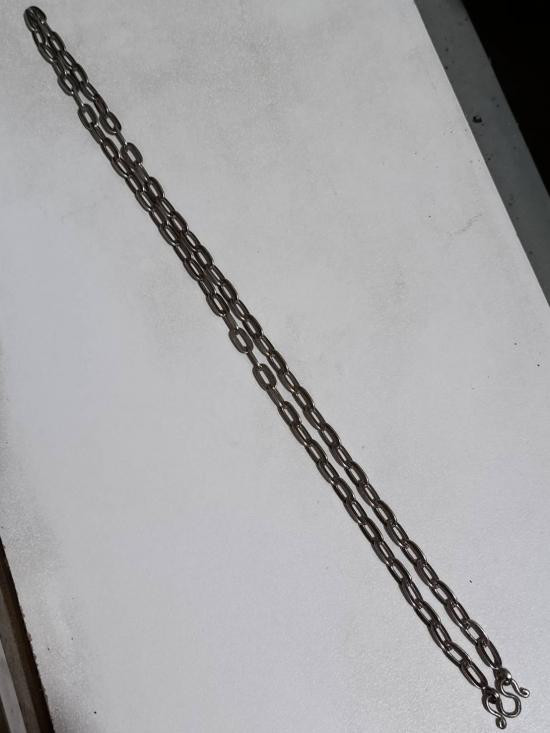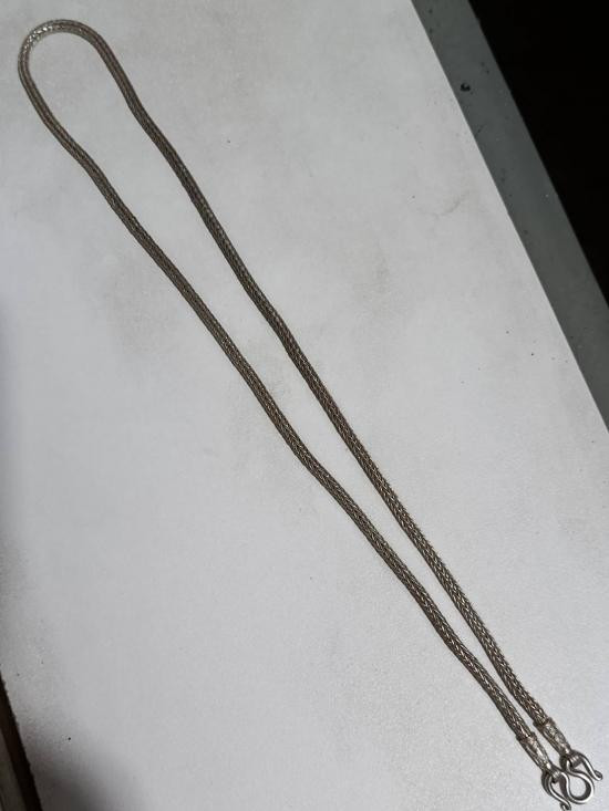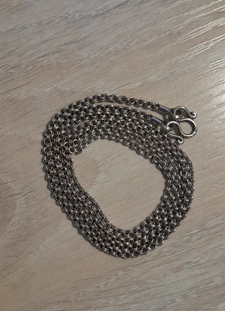 เคาะเียวแดง สร้ายเงินเก่า ไม่มีตะขอ มีแต่สร้อย งานเก่า หนัก 8 กรัมกว่าๆ |