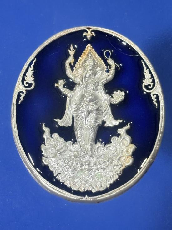 เหรียญหล่อพุทธศิลป์เทวฤทธิ์ พระพิฆเนศ-พระราหู รุ่นเศรษฐีเทวฤทธิ์ หลวงพ่อหวั่น วัดคลองคูณ เนื้อเงินลงยาน้ำเงิน น้ำหนัก 28.83 กรัม |