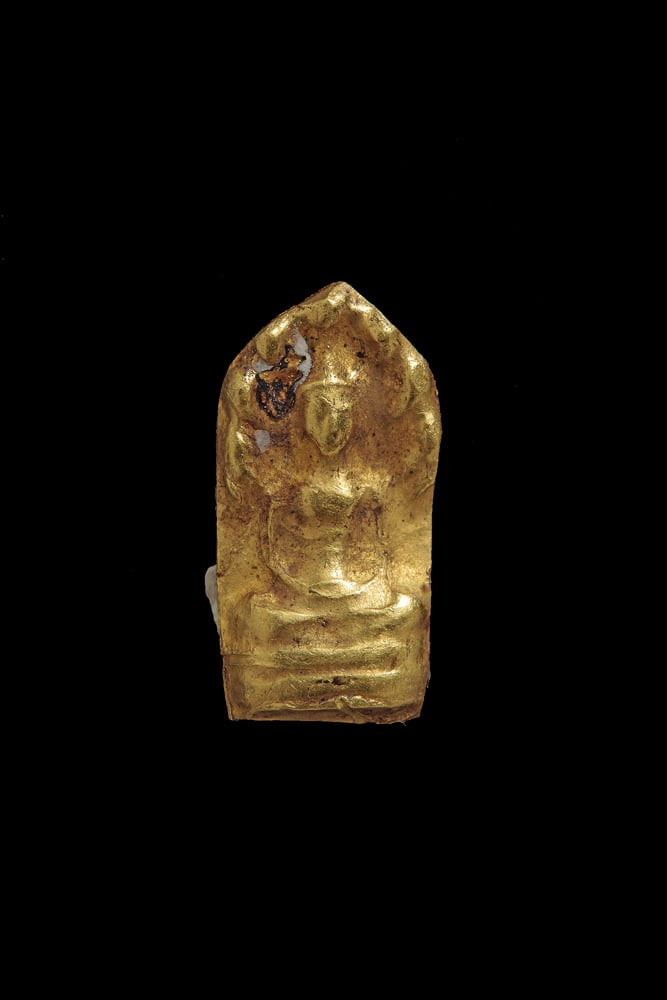 ปรกใบมะขาม เนื้อทองคำ เก่าไม่ทราบที่ ขนาดเล็กกว่าเหรียญบาท ทองคำแท้%สูง มีใบตรวจยิงได้ 87.68% น้ำหนัก 0.62 กรัม |