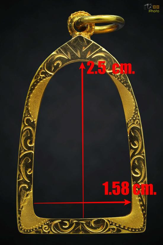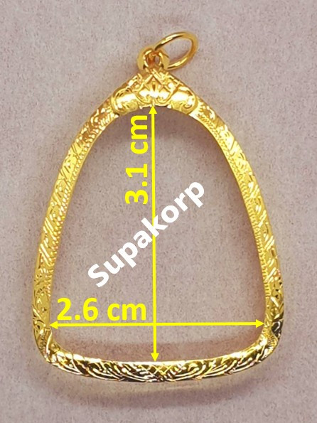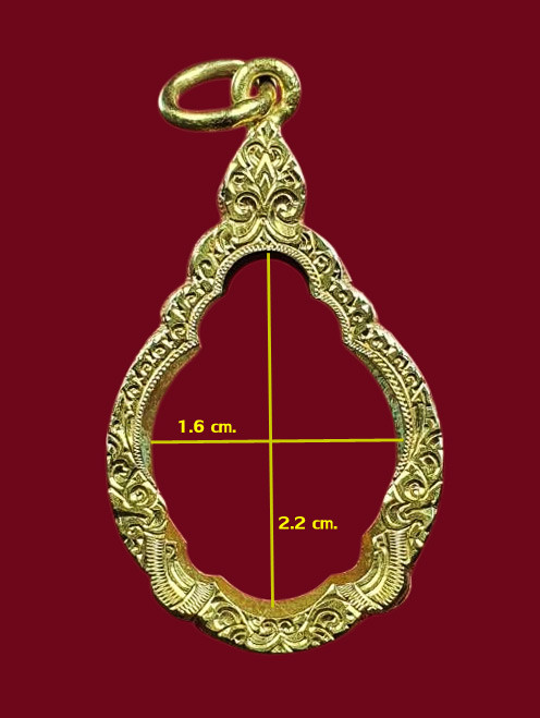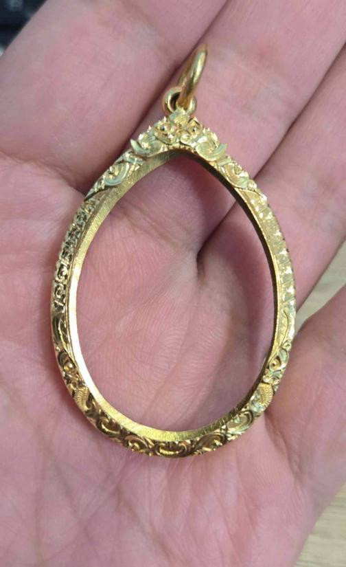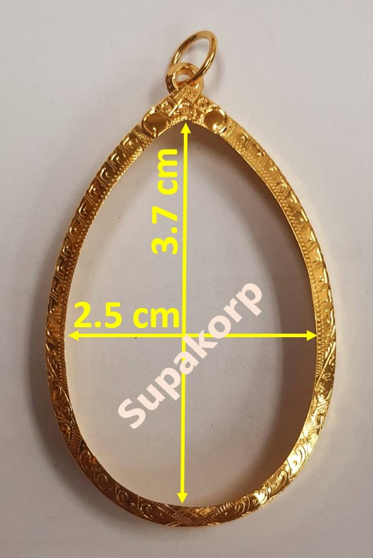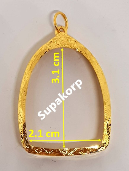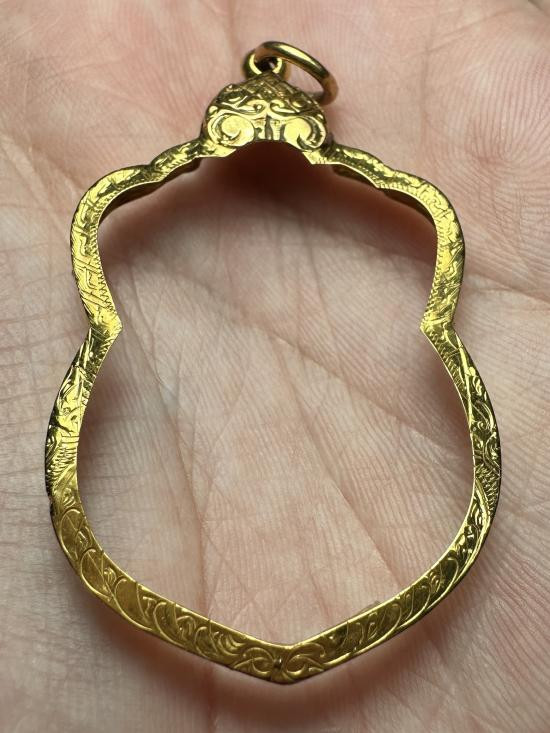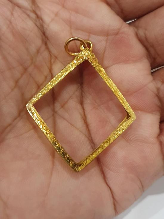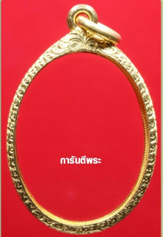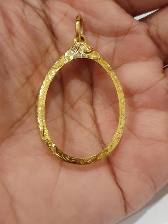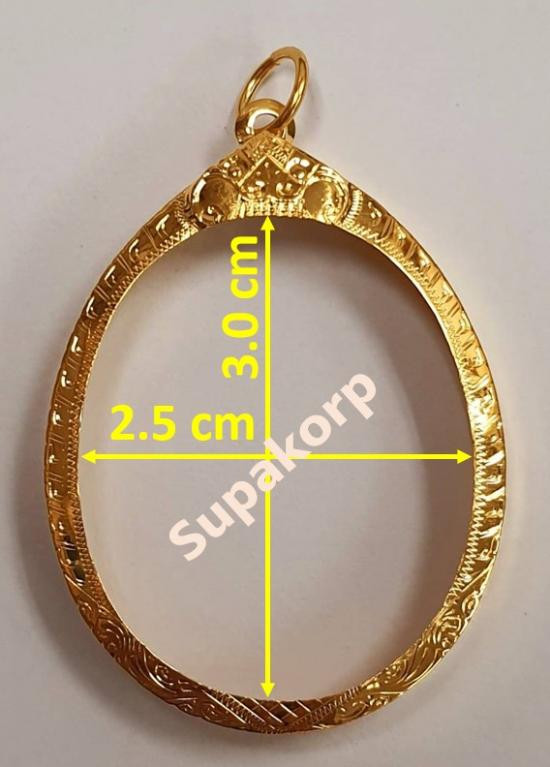 กรอบทองคำแท้ ทรงเหรียญรูปไข่ ยกซุ้มหัวสิงห์ น้ำหนักประมาณ 5.9 กรัม เปอร์เซ็นสูง 83.88% |