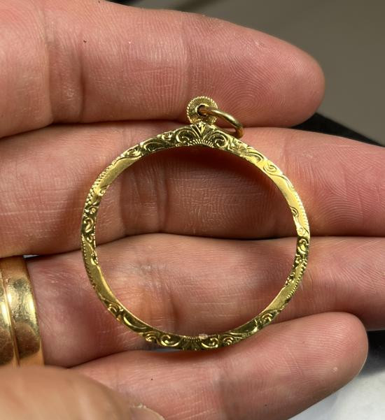 กรอบทองคำแท้ ทรงกลม (เส้นผ่าศูนย์กลาง 3.4 ซม.) น้ำหนักประมาณ 8.53 กรัม เปอร์เซ็นสูง |