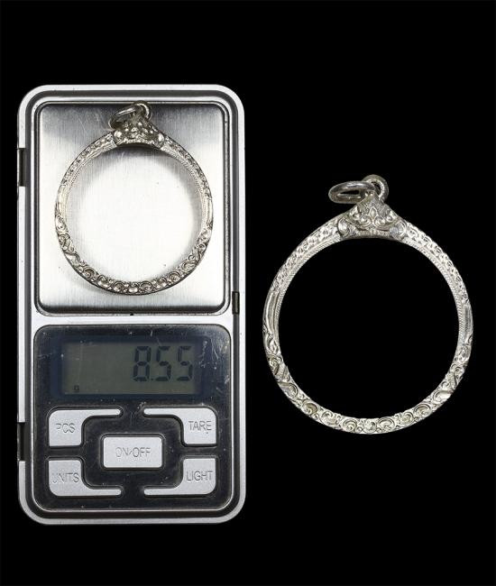 <<กรอบเงินแท้95%>>มือหนึ่ง ยกซุ้มหัวสิงห์ย้อย ใส่เหรียญหลวงพ่อกวย หลังหนุมาน-หลังยันต์ งานมือช่างทองแกะลายลึกๆสวยๆ หนัก5.61g |