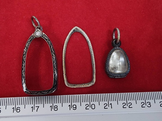 กรอบเงินแท้ 92.5% ตอกห่วง925 งานขึ้นมือยกซุ้มแกะลายฝีมือช่างชั้นครู ขนาดกว้าง2.2 สูง2.8ซม. น้ำหนัก4กรัม พิมพ์รูปไข่พระผงดวงเศรษฐี หลวงปู่หมุน หรือขนาดใกล้เคียง กรอบพับหลังมือ1 |