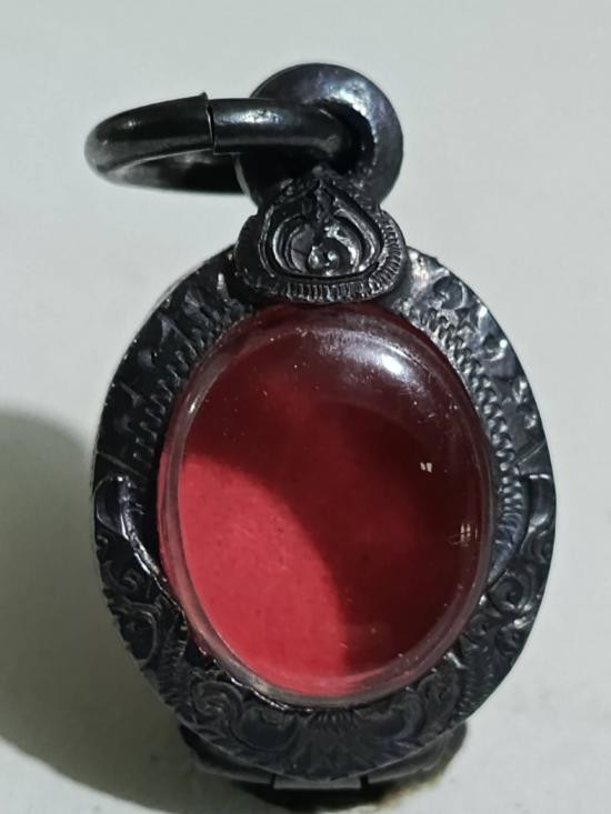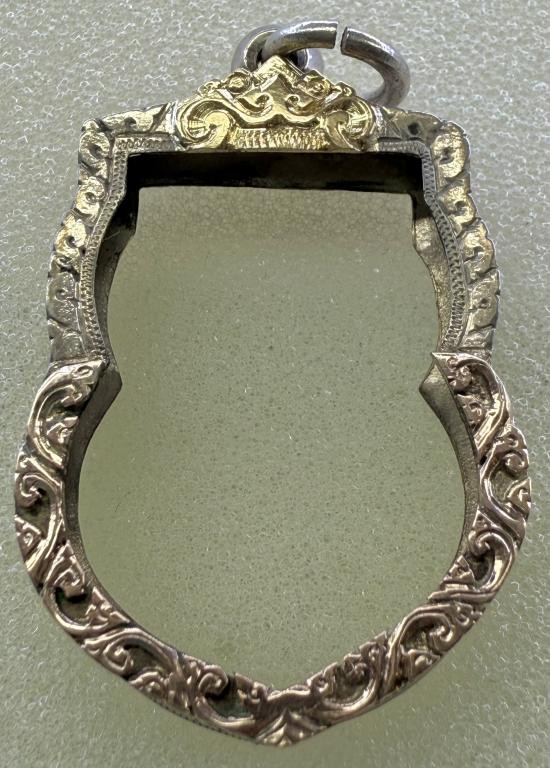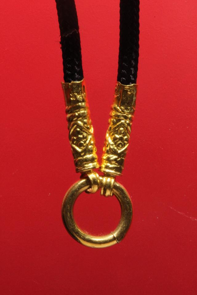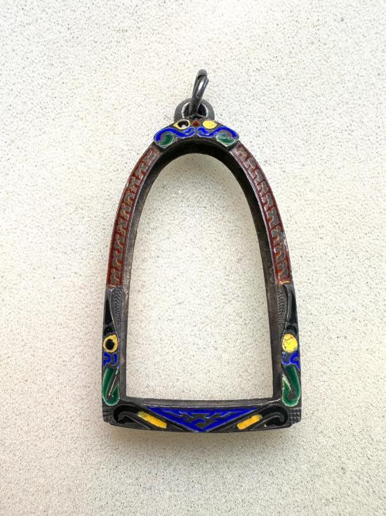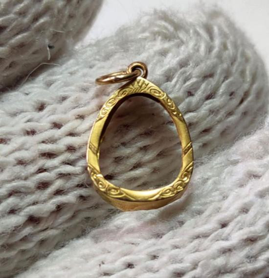 กรอบทองคำแท้ ทรงเหรียญรูปไข่ ยกซุ้มหัวสิงห์ น้ำหนักประมาณ 5.9 กรัม เปอร์เซ็นสูง 83.88% |