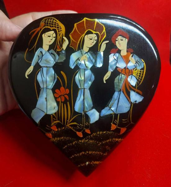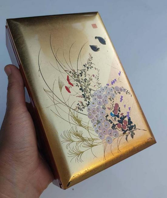 กล่องเครื่องประดับ-อุปกรณ์พระเครื่อง MADE IN JAPAN ของญี่ปุนฝาเพ้นลายทาทอง เป็นกล่องดนตรีด้วย ใช้งานได้