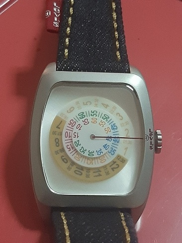 นาฬิกาข้อมือ แบรนด์ "ลีวายส์" (Levi's) ดีไซน์พิเศษ ที่มีหน้าปัดแบบดิสหมุนและสายยีนส์ สถาพใหม่ไม่เคยใช้พร้อมกล่องเดิมๆ สภาพสวยมากๆ การเดินได้ดีปดกติ (เคาะเดียว) |