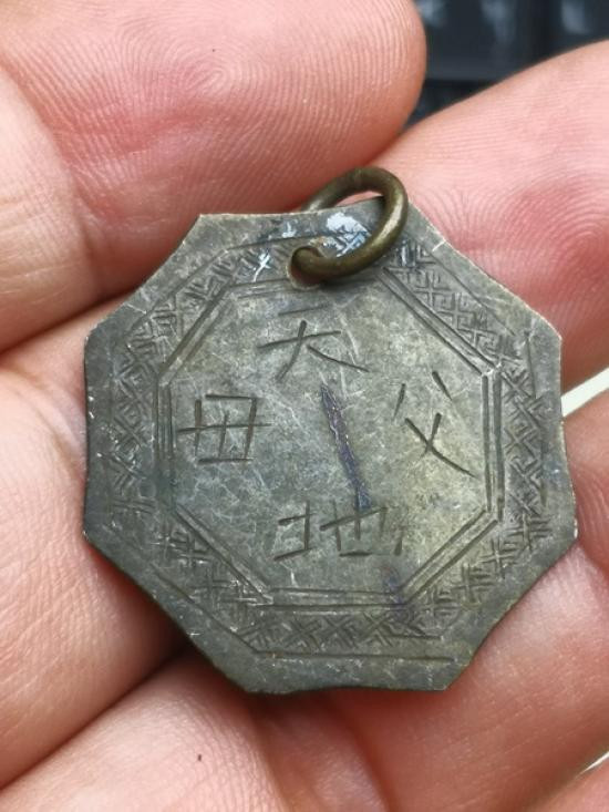 เหรียญแปดเหลี่ยม ห่วงเชื่อม ภาษาจีนเก่าไม่ทราบที่ สภาพผิวหิ้งตามรูปราคาเบาๆ |