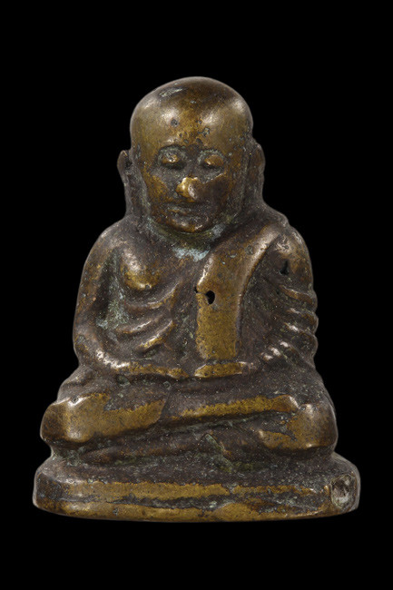 เคาะเดียวแดง.....รูปหล่ออุดกริ่ง พระสังกัจจายน์ เนื้อทองเหลืองรมดำ ไม่ทราบที่ (กริ่งดัง) |