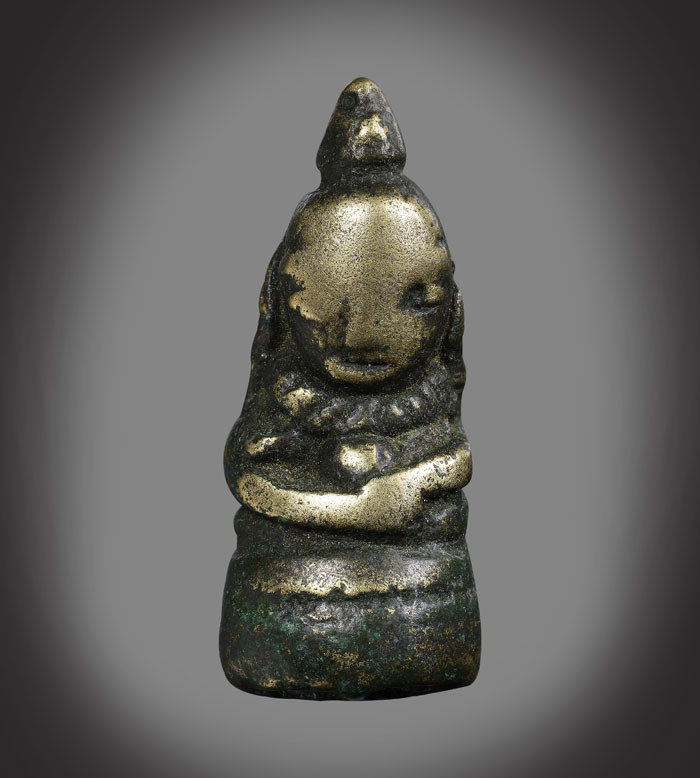 พระอุปคุต พิมพ์หมวกฤาษี ถือดอกบัว หล่อโบราณ เนื้อทองผสมแก่ทองแดงเถื่อน มีอุดกริ่งใต้ฐาน |