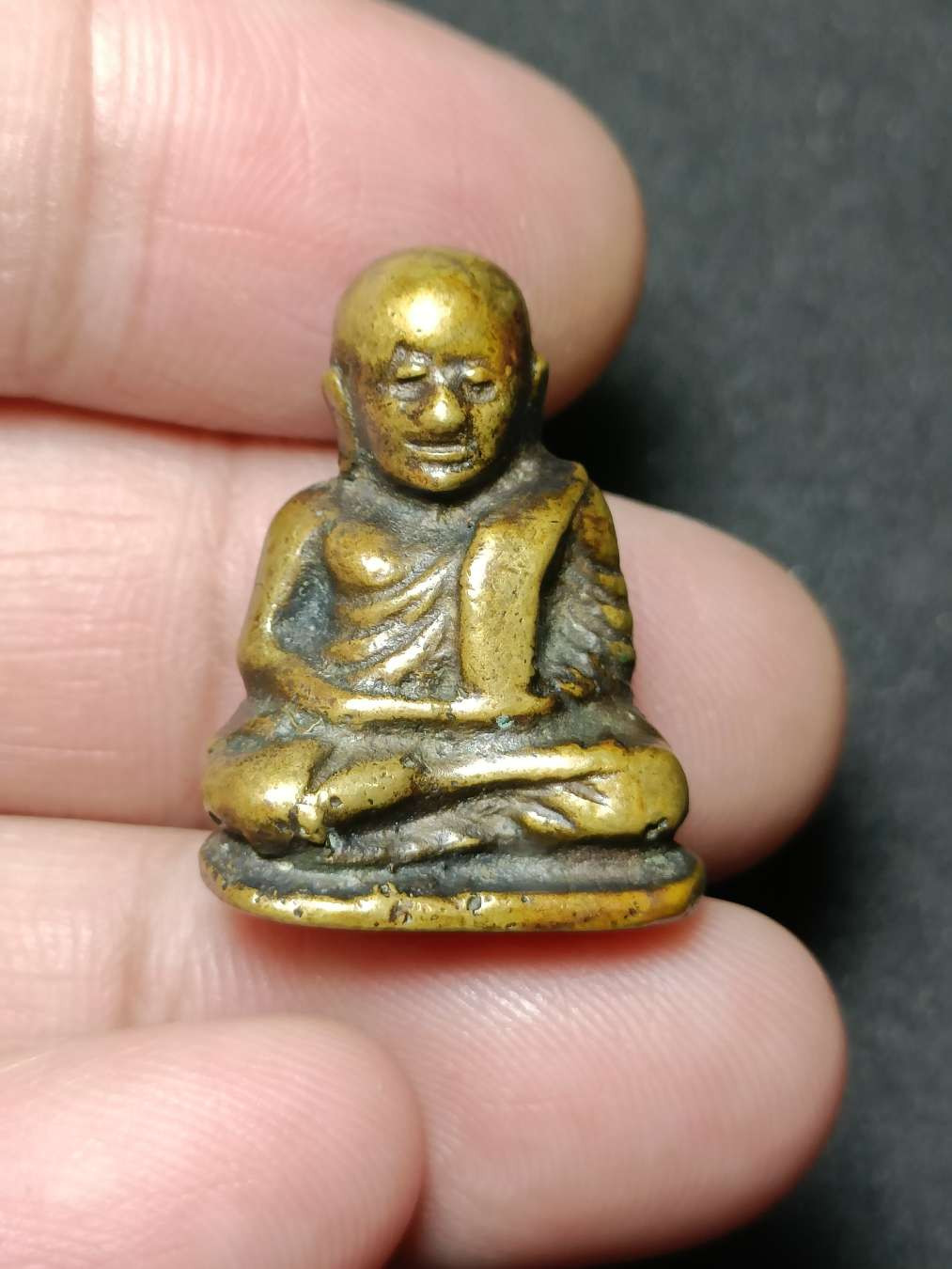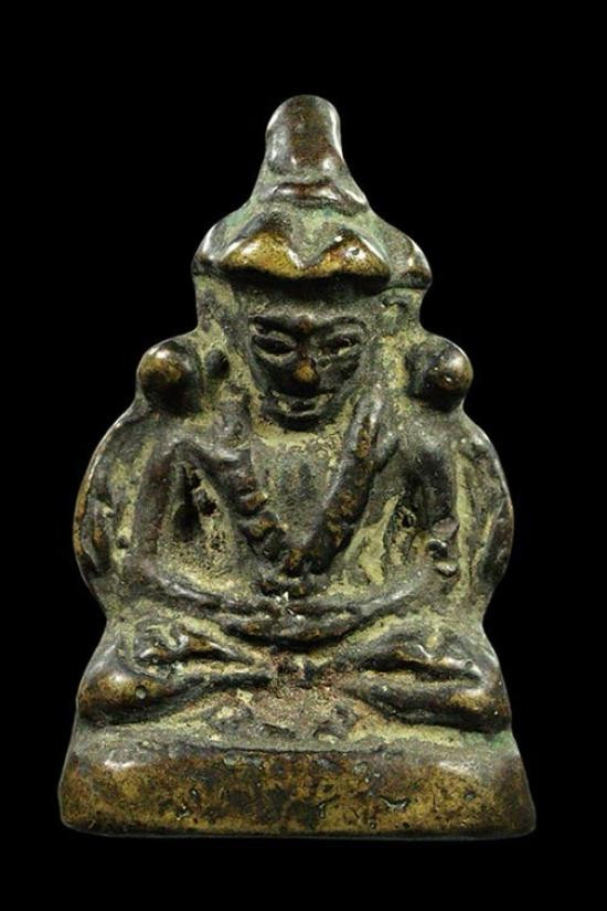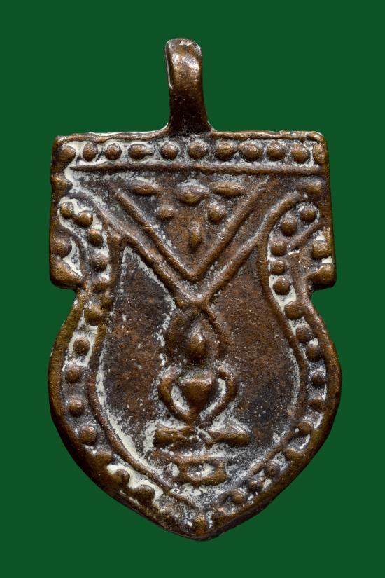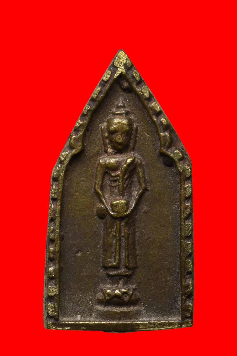 รูปหล่อสามเหลี่ยมเนื้อสัมฤทธิ์อุดครั่งแดง ไม่ทราบเกจิ วัดใจ จบเท่าไหร่เท่านั้นพระเหมามา |