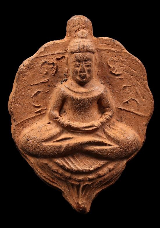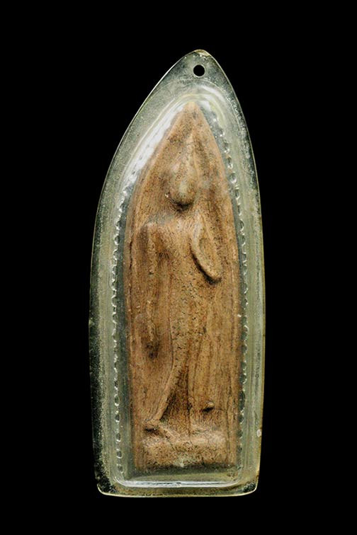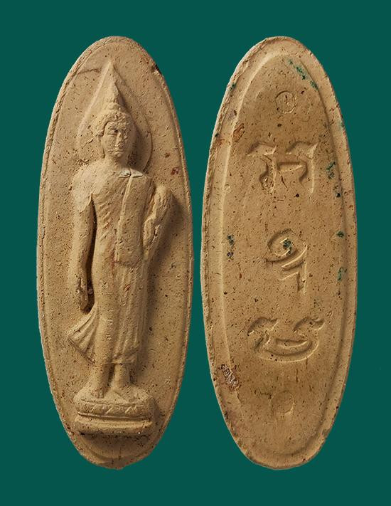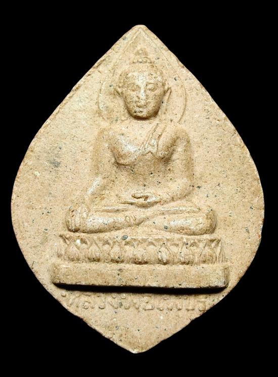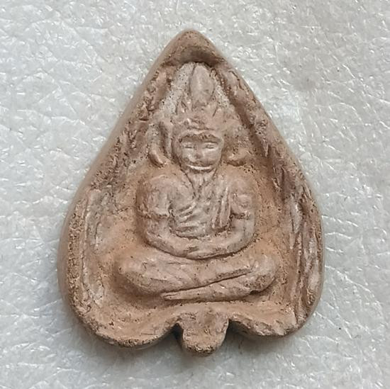 พระผงเนื้อดินหลวงพ่อฤาษีลิงดำฤษีท่องสวรรค์ พิมพ์ใบโพธิ์ ด้านหลังมีปั๊มมั่งมีศรีสุข |