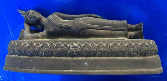 พระบูชาปางไสยาสน์(พระประจำวันอังคาร) อุดปูนผสมผงปั๊มตรา เนื้อทองเหลืองมีอายุ ขนาดความยาว 10.5 นิ้ว ไม่ทราบสำนัก |