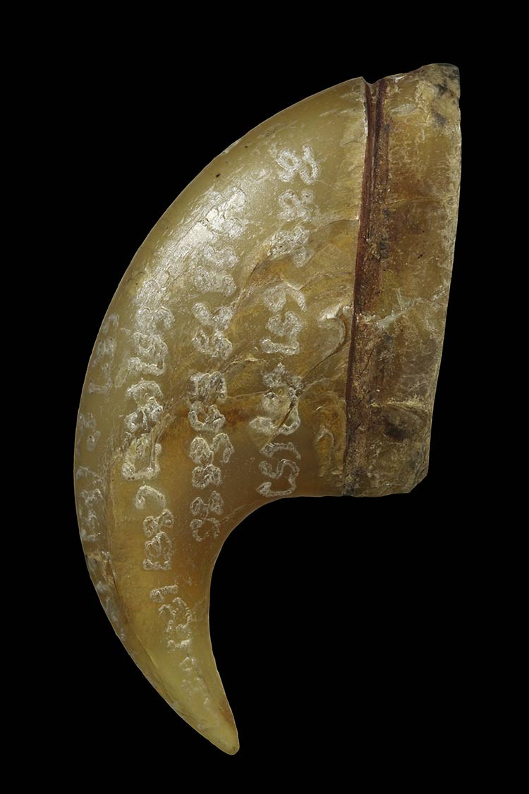 (วัดใจ)เขี้ยว/ฟันแกะเป็นรูปเสือ พร้อมจารยันต์ (ไม่ทราบที่)ขนาด อ้วน 0.9 cm ฐาน 1.7 cm สูง 3.5 cm |