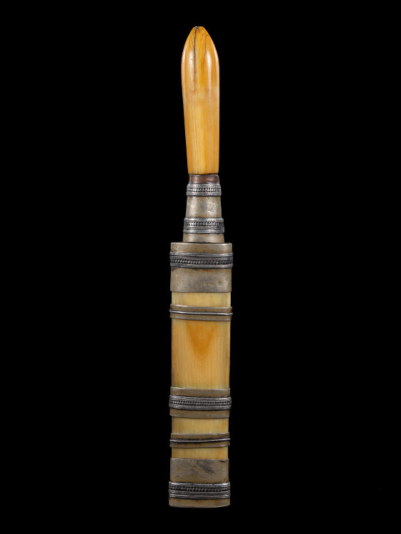 เขี้ยวเสือแกะเก่า ยาว 1 นิ้วมีจาร อยู่ในสีผึ้ง ใส่อูบทองเหลืองเก่า |