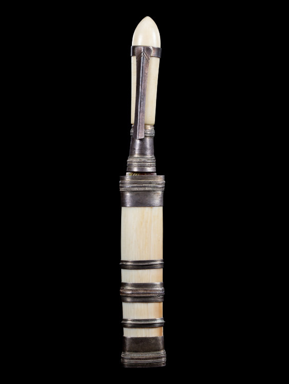 ตระกรุดถักเชือก ยาวประมาณ 2 นิ้ว เลี่ยมเงินอย่างดี ไม่ทราบที่คับ |
