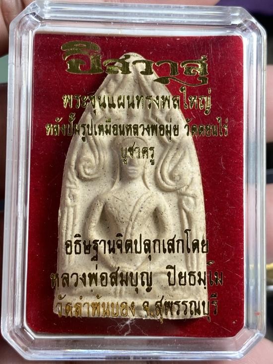 วัดใจ 100 บาท ขุนแผนทรงพลใหญ่หลวงพ่อสมบุญ วัดลำพันบอง จ สุพรรณบุรี ด้านหลังบูชาคุณ หลวงพ่อมุ่ย |