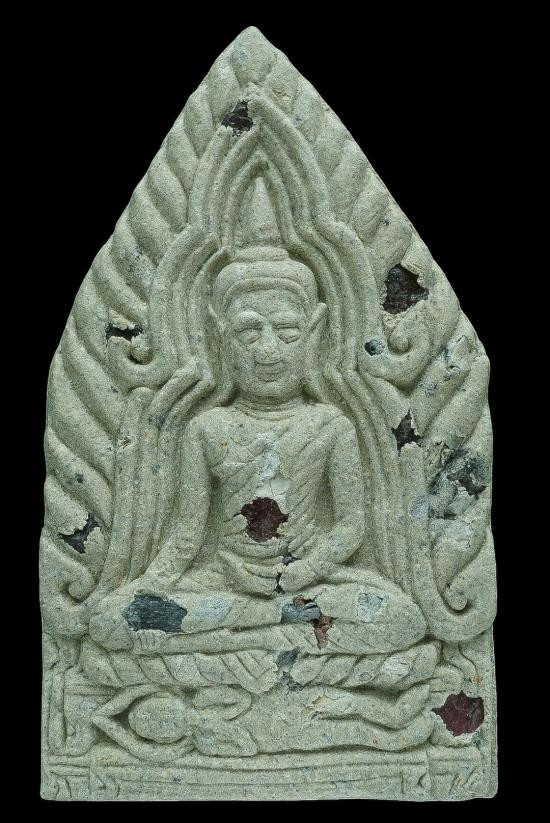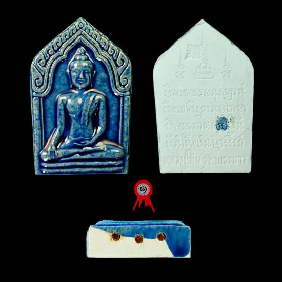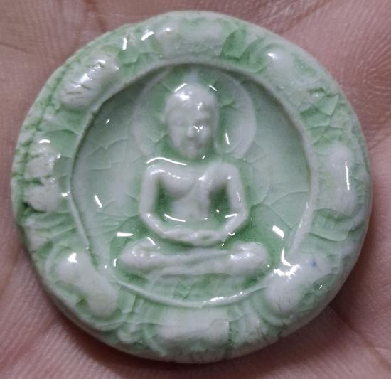พระปทุมธรรมขันธ์ เนื้อกระเบื้องเคลือบ สีเขียว ด้านหลังฝังทับทิม หลวงป๋า วัดหลวงพ่อสดธรรมกายาราม จ.ราชบุรี |