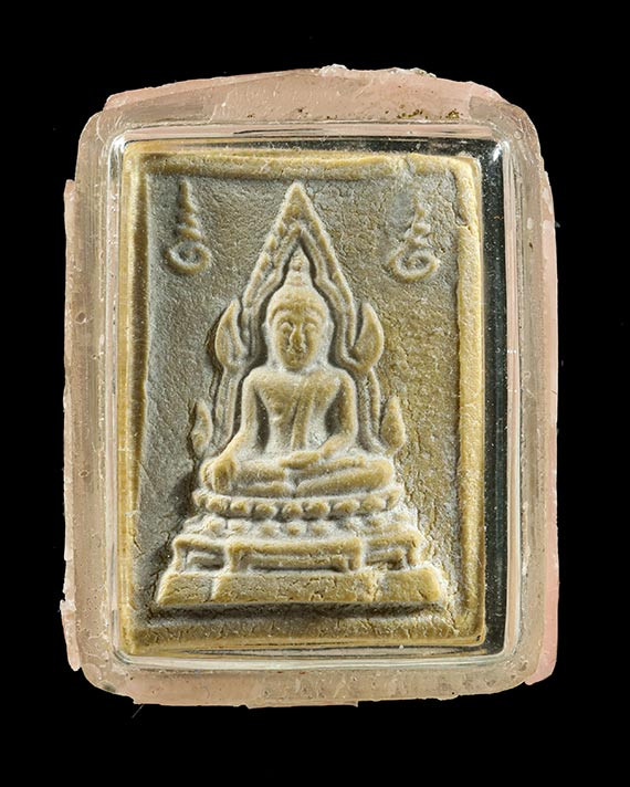 พระพิมพ์ งบน้ำอ้อย เนื้อดินเผา หลวงพ่อลำใย สัญญโม วัดสะแก จ.อยุธยา จัดสร้างประมาณปี 2545 |