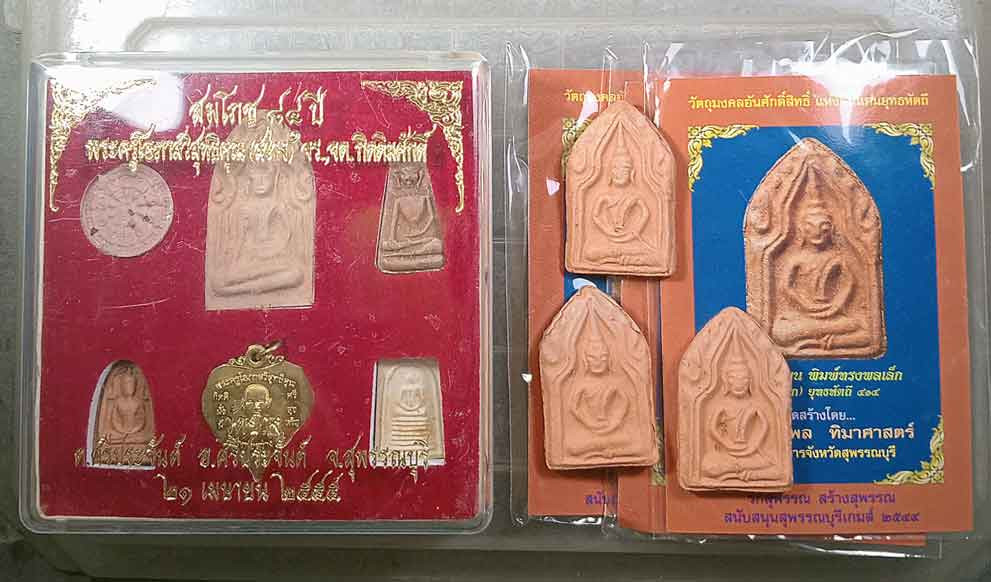 พระผงเจ้าสัวเสือนอนกิน เนื้อผงเศรษฐีทั้ง 5 + พระผงหลวงพ่อปลดหนี้ เนื้อผงยาจินดามณี + รูปหล่อท้าวเวสสุวรรณ รุ่นซื้อที่ดิน หลวงพ่อแม้น วัดหน้าต่างนอก (เคาะเดียวครับ) |