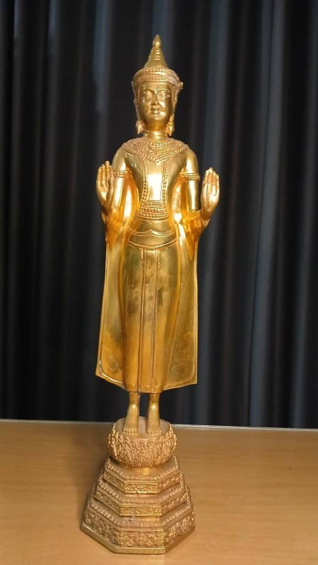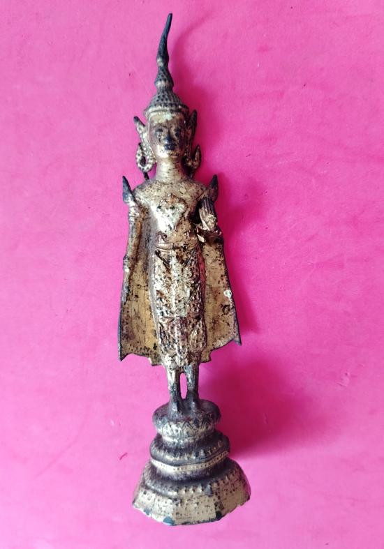 พระพุทธรูปบูชาสมัยรัตน ปลายเกศงอมาข้างหน้าเนื้อสัมฤทธิ์ ขนาดยืนจากฐานถึงปลายเกศ 16 เซนติเมตร ลงลักปิดทองร่องชาด ใต้ฐานดินไทย​ สภาพรักทองสวยสมบูรณ์​ รับประกันตามกฏครับ |