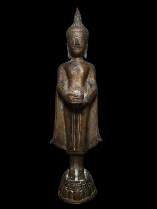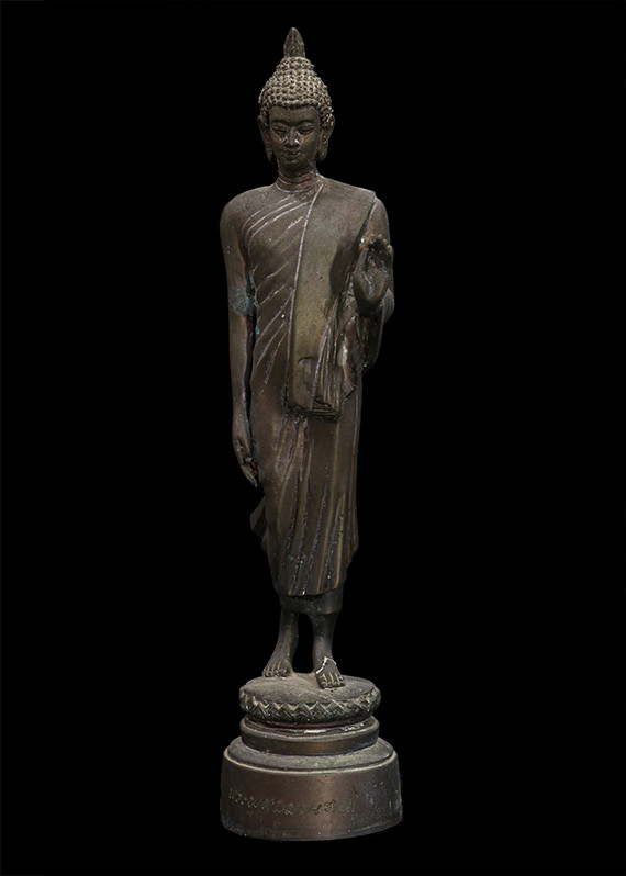 พระบูชาปางประทานพร สูง 11 นิ้ว ฐานกว้าง 5 นิ้ว เนื้อทองเหลือง หล่อหนา ผิวหิ้งกลับดำ มีอายุ |