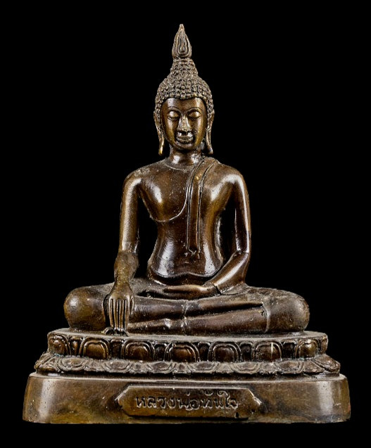 หลวงพ่อพระพุทธศิลาศักดิ์สิทธิ์ วัดอินทาราม จ.นครสวรรค์ พ.ศ.2530 หน้าตัก 9 นิ้ว เนื้อโลหะรมมันปูผิวหิ้ง ใต้ฐานอุดปูนฝังพระผงมวสาร 2 องค์ !! |