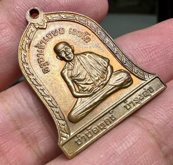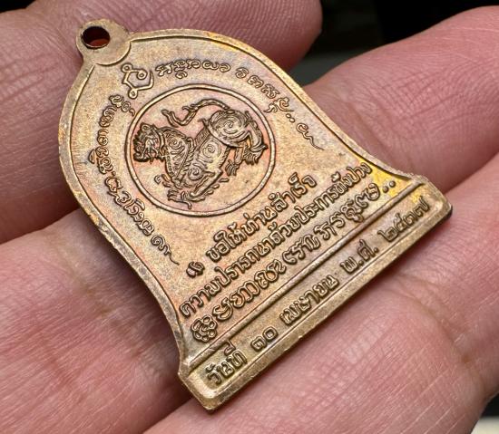 เหรียญระฆังหลังสิงห์ รุ่นบำบัดทุกข์ บำรุงสุข หลวงพ่อเกษม เขมโก เมตตาปลุกเสก ที่สุสานไตรลักษณ์ จ. ลำปาง ปี2537 เนื้อทองแดงผิวไฟ