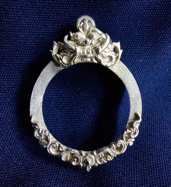 | ชื่อพระเครื่อง | กรอบเงิน หน้ายักษ์ กนกล่าง ขนาด 2.5 x 2.2 ซ.ม. + แผ่นปิดหลัง ไม่ผ่านใช้ |