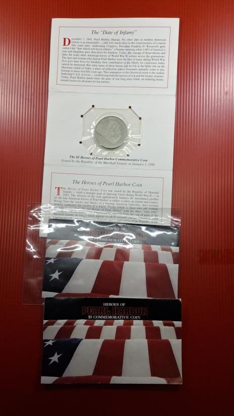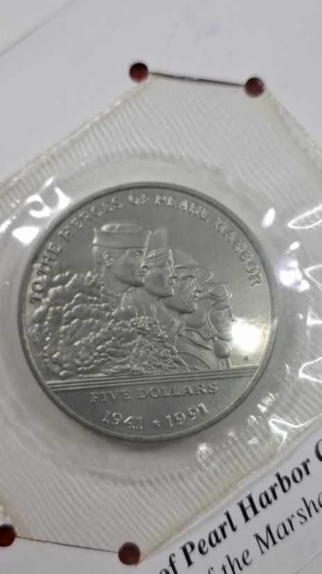 เหรียญกษาปณ์ที่ระลึก "วีรบุรุษแห่งเพิร์ลฮาร์เบอร์" (Heroes of Pearl Harbor) ชนิดราคา 5 ดอลลาร์ ออกโดยหมู่เกาะมาร์แชลล์ในปี 1991 |