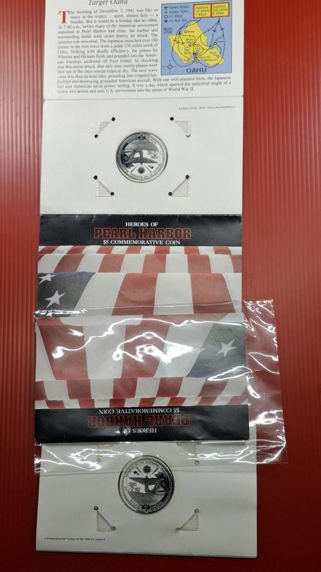 เหรียญกษาปณ์ที่ระลึก "วีรบุรุษแห่งเพิร์ลฮาร์เบอร์" (Heroes of Pearl Harbor) ชนิดราคา 5 ดอลลาร์ ออกโดยหมู่เกาะมาร์แชลล์ในปี 1991 ทั้งหมด3เหรียญ พร้อมแพ็คเกจเดิมๆๆ |